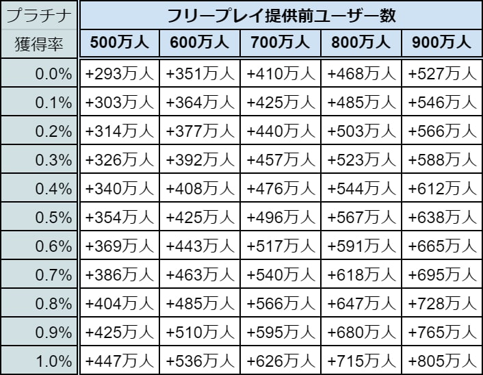 ベースとなる「提供前ユーザー数」や「提供後のプラチナトロフィー獲得率」が増加にどのような影響を及ぼすかは、下記に表形式でまとめました。